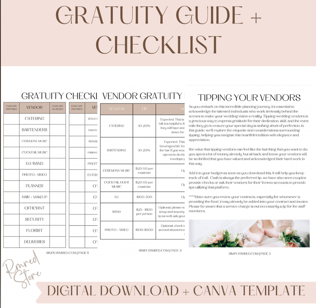 Congratulations on your upcoming celebration of love! As you embark on the journey to create the wedding of your dreams, don't forget the unsung heroes who make your day extra special. Our Wedding Gratuity Guide and Checklist are here to help you express gratitude to those who contribute to the magic.